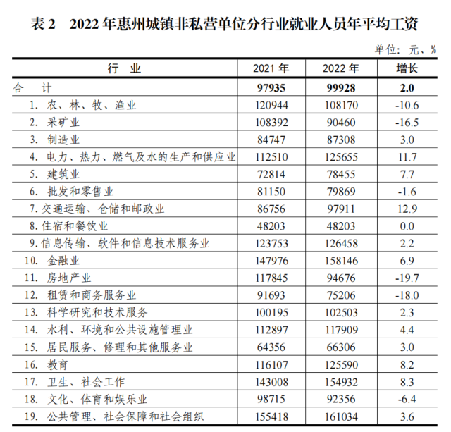 近日,惠州市統計局公布了2022年城鎮單位就業人員年平均工資情況。數據顯示,2022年,惠州市城鎮非私營單位就業人員年平均工資99928元,與2021年的97935元相比,增加1993元,同比增長2.0%。其中,在崗職工年平均工資101386元,同比增長2.1%。