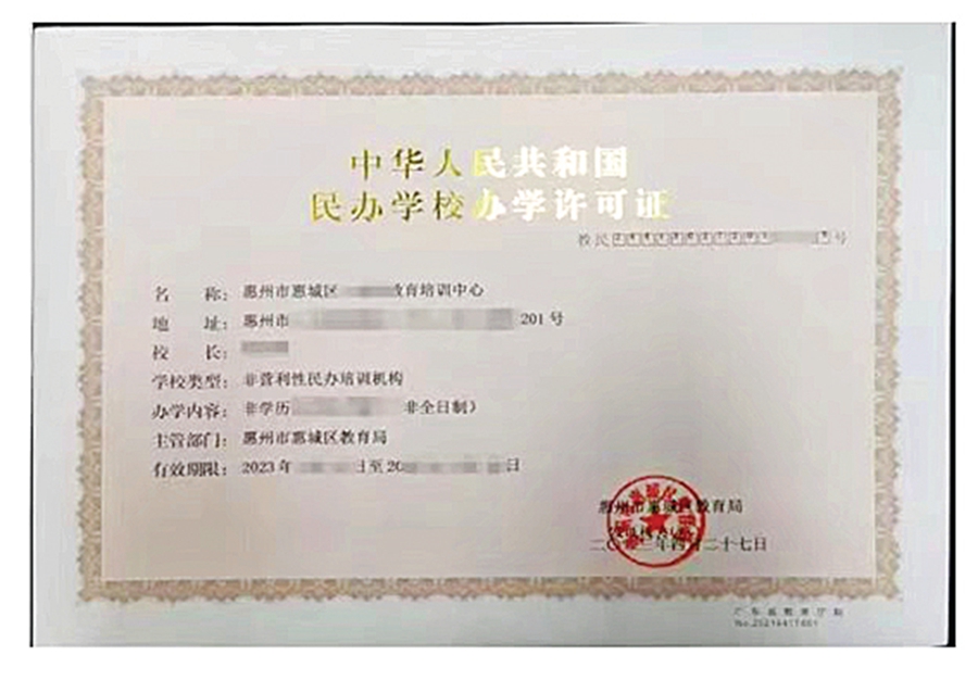 據了解,校外培訓機構應有教育行政部門頒發的《中華人民共和國民辦學校辦學許可證》(以下簡稱“辦學許可證”)和《民辦非企業單位登記證書》或《工商營業執照》,并懸掛在培訓場所顯著位置,且按照辦學許可證審批的培訓項目來開展培訓。往往很多家長要求機構出示相關證件,而看到的只有《工商營業執照》,經營范圍中雖有教育咨詢、教育信息咨詢服務等涉“教育”字樣,但未取得《辦學許可證》的機構不屬于證照齊全的合規機構。