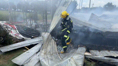 現場消防員立即出兩支水槍滅火,同時安排人員抬手臺機動泵利用附近魚塘出水滅火。