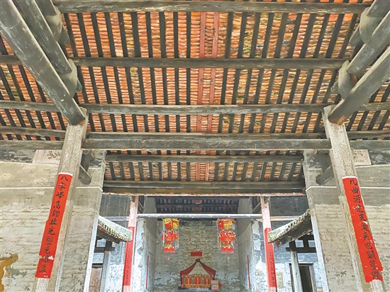 江廈人才輩出,離不開挺華書舍的培育。書舍位于江廈新圍,建于清代中期。遠遠望去,可見門楣上陰刻楷體“挺華書舍”四字,筆法遒勁有力。據介紹,書舍占地300多平方米,四進三開間,雕花的屋檐、廊柱、屏風、木門精美,支撐建筑的石柱、青磚,也完好無損。