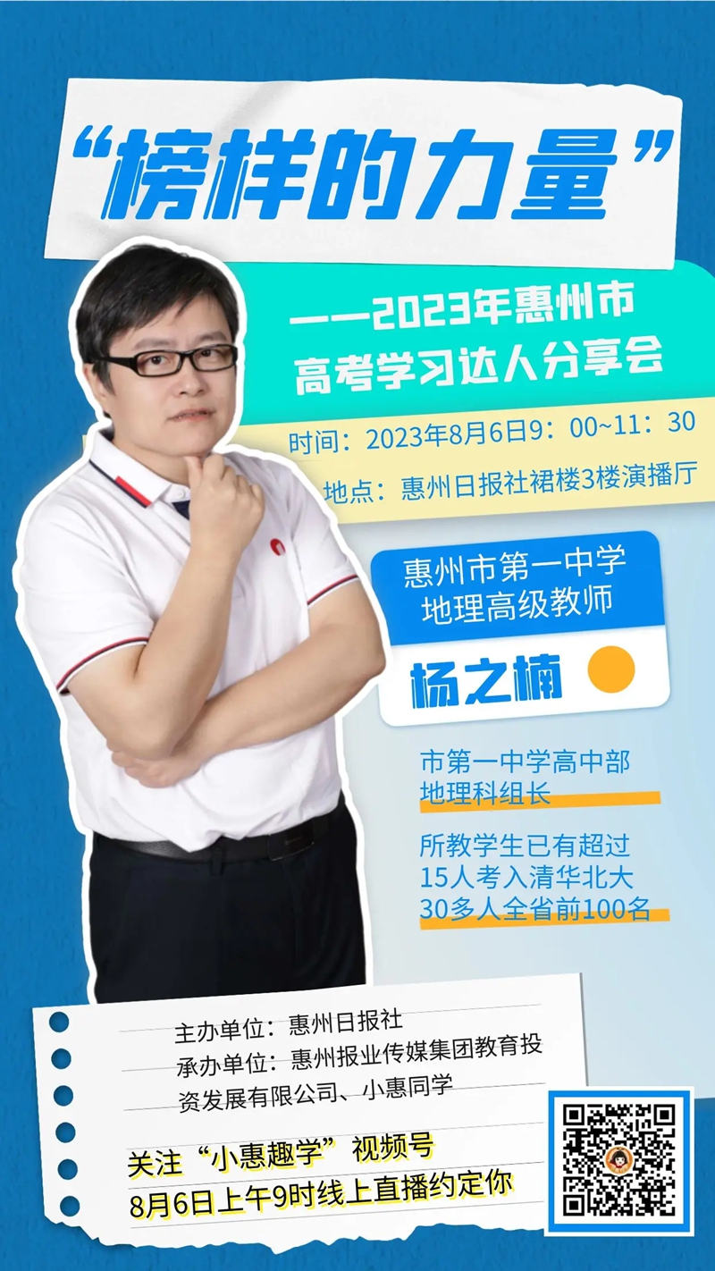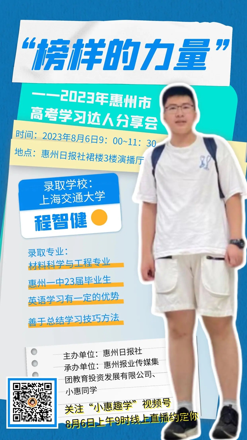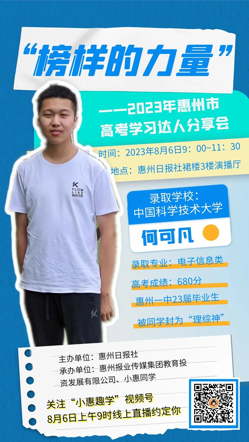 對于黃一立和其他高分學長學姐們的高考故事,我們將在“榜樣的力量”——2023年惠州市高考學習達人分享會上與各位家長同學們進行現(xiàn)場交流,分享會設有問答環(huán)節(jié)。