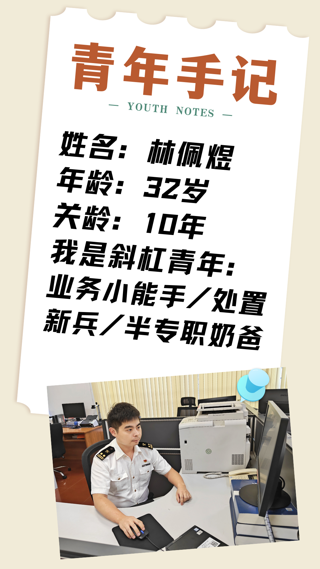 我是惠州海關駐淡水辦事處監管一科的林佩煜,今年是我進入海關工作的第十個年頭。十年來,我從事過碼頭監管、加貿保稅、辦公綜合、機要保密、人事政工、后續稽查、綜合業務以及后續處置等工作,豐富的工作經歷也給我帶來了豐富的業務知識。