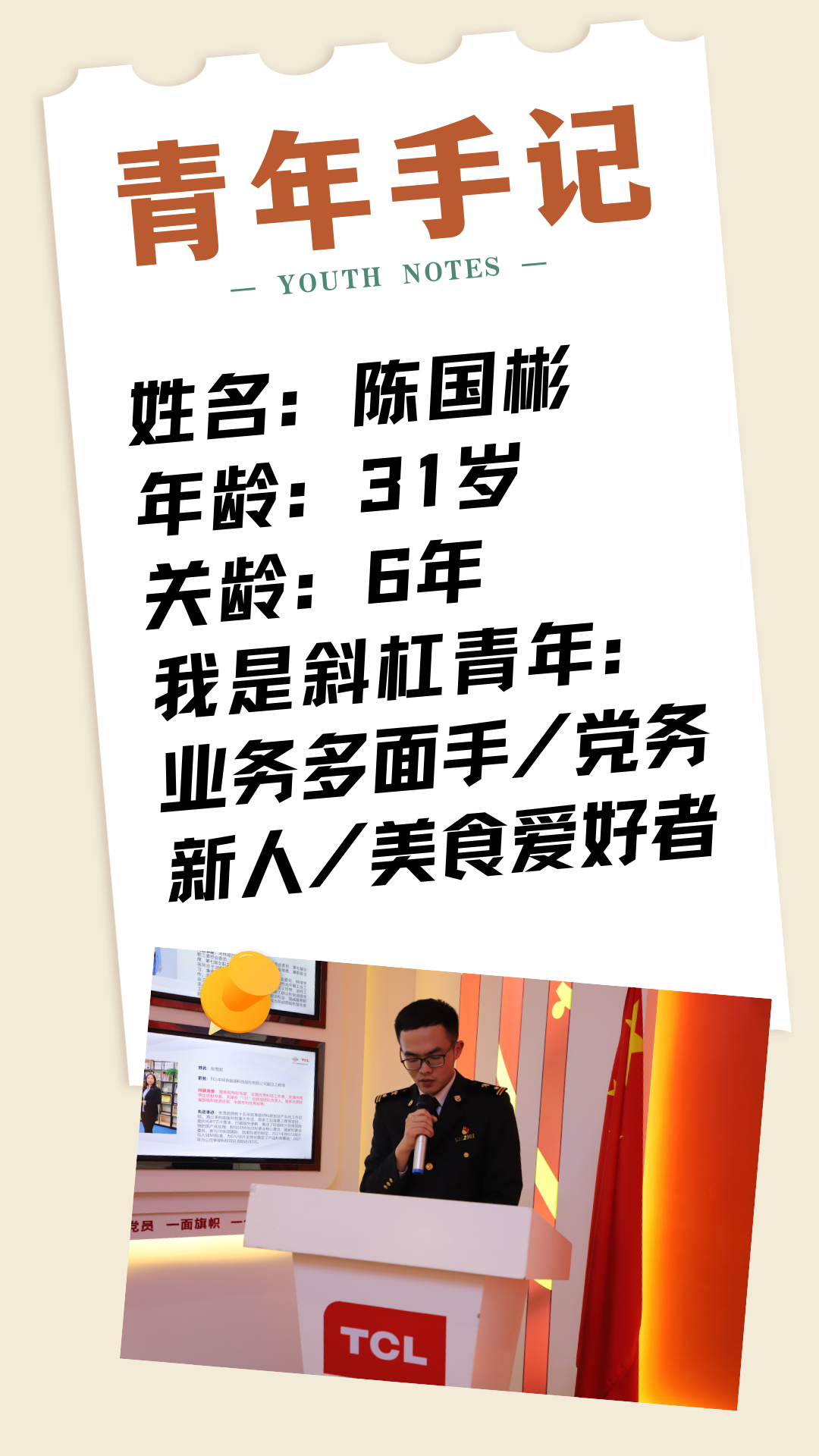 我是來自惠州海關綜合業務科的陳國彬。還記得自己入關的第一個崗位是辦公室機要崗。起初當我面對一份份文件和一摞摞微微發黃的歷史檔案時,無從下手。當辦公室的老檔案人給我講述陳為人夫婦、張人亞父子用生命守護檔案的光輝事跡后,我的內心深感慚愧,深刻認識到守得住初心耐得住寂寞是默默無聞的檔案工作者必備的特質,在日積月累的學習和實踐中,自己逐漸從不知所措到有的放矢。去年,結束了四年的辦公室磨礪,如今的我正接受著新的挑戰,面對企業的困惑、報關員的疑難,辦事員的急迫,我變得更加從容、果敢,在業務改革,政策宣講,基層黨建工作上發揮著自己的作用,從一個業務小白正慢慢成長為業務多面手。