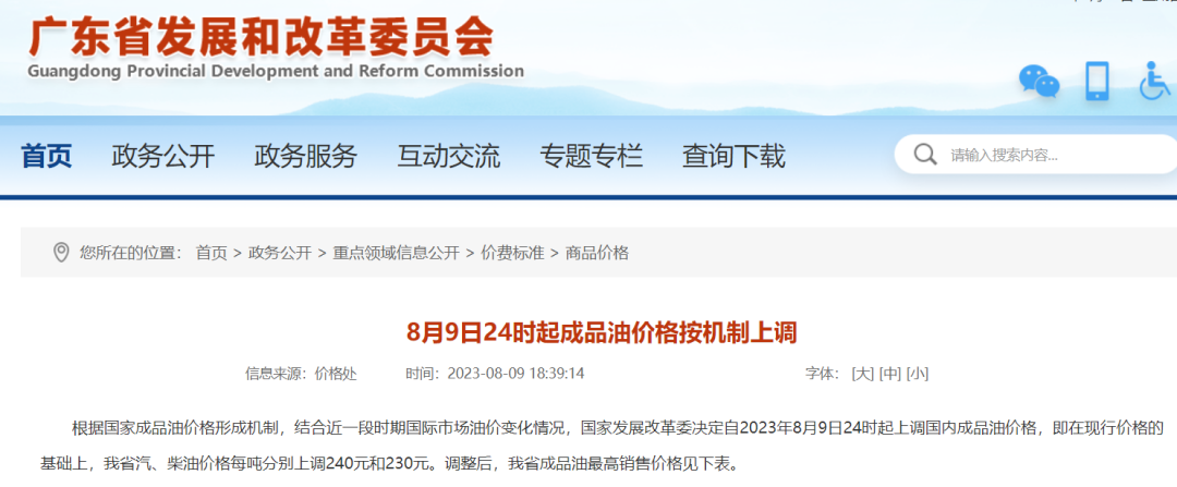 根據近期國際市場油價變化情況,按照現行成品油價格形成機制,自2023年8月9日24時起,國內汽、柴油價格(標準品,下同)每噸分別提高240元、230元。調整后,各省(區、市)和中心城市汽、柴油最高零售價格見附表。相關價格聯動及補貼政策按現行規定執行。