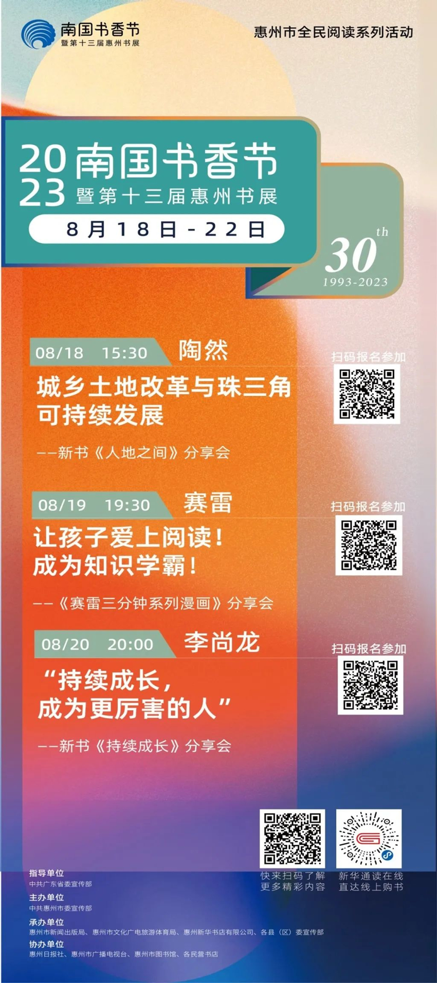 由中共廣東省委宣傳部指導,中共惠州市委宣傳部主辦的2023南國書香節暨第十三屆惠州書展即將于8月18日開幕,展期5天,將通過線上線下的形式舉行近百場各類全民閱讀活動,營造“書香滿城,全民閱讀”氛圍。