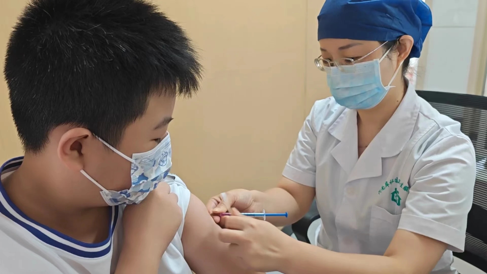 一學(xué)生在惠城區(qū)金山湖社區(qū)衛(wèi)生服務(wù)中心接種疫苗。