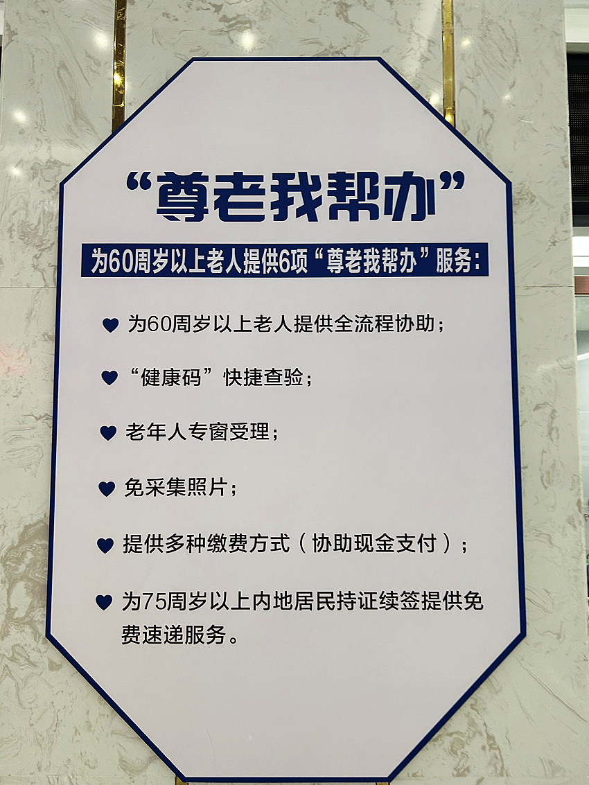 在惠州市政務服務中心三樓辦證大廳的顯眼位置懸掛著《尊老我幫辦》便民信息。惠報全媒體記者嚴東東 攝