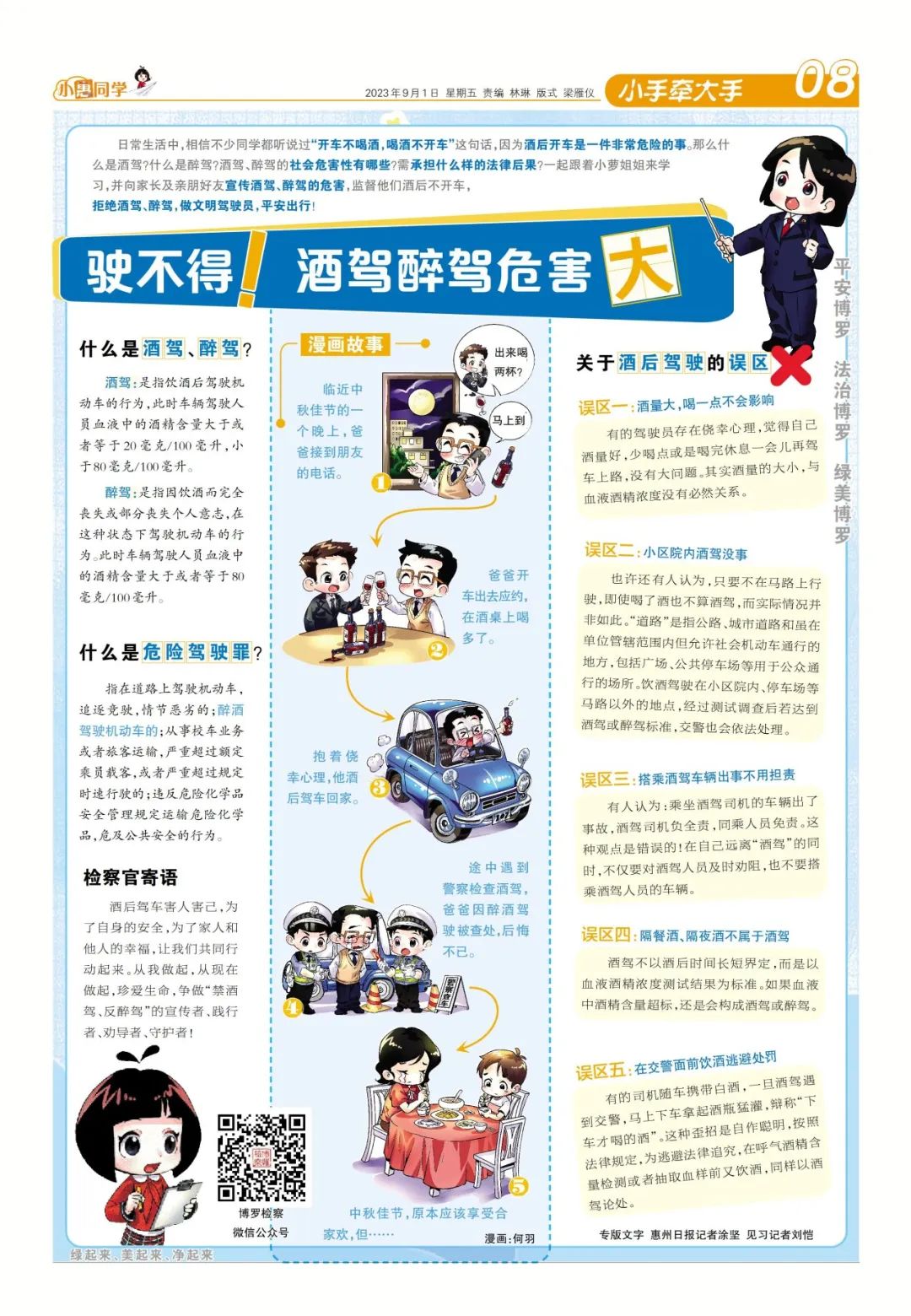 惠州檢察機關積極開展“小手拉大手”系列活動,通過定制普法法治報、送法進校園、致家長的一封信、簽訂拒絕酒后駕駛承諾書等方式,將預防酒醉駕宣傳工作從社會延伸至學校反饋到家庭,充分發揮孩子在家庭日常生活中拒絕酒駕醉駕宣傳員和監督員的作用,實現小家庭帶動大社會,營造良好的社會氛圍。博羅縣檢察院于秋季開學推出定制的“法治報”,報刊內容包含整版預防酒醉駕宣傳內容,共計贈閱12.6萬余份,覆蓋博羅縣所有小學生。