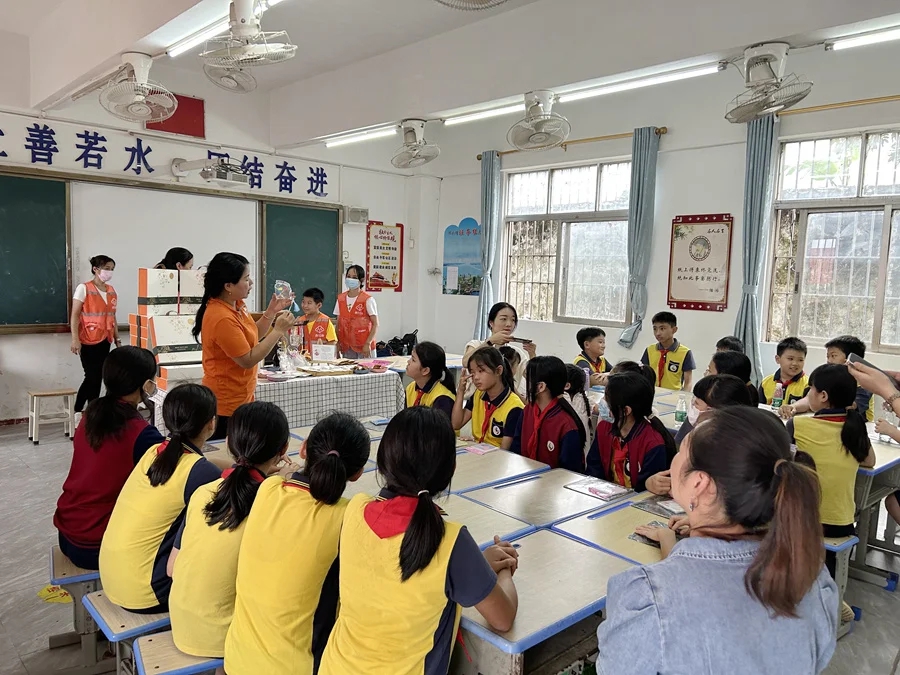 志愿者與水口街道鹿崗小學師生互動玩游戲。