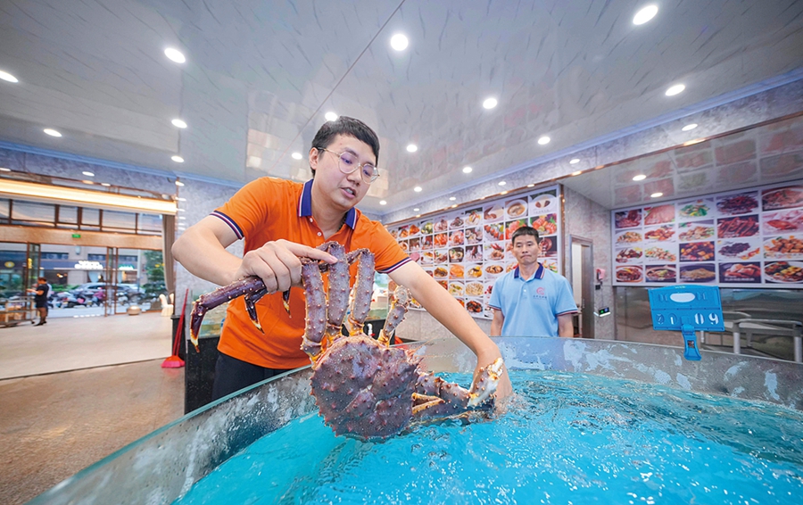 記者在酒樓內看到,新店一樓設置了宴會廳及多個展示區,酒柜上擺滿白酒、紅酒及洋酒琳瑯滿目的各種酒類,其中有不少年份久具有收藏價值的老酒。作為店里重要食材的海鮮展示區,也設置在一樓,帝王蟹、澳洲龍蝦、鮑魚、生蠔、象拔蚌、石斑魚、各種貝殼類……幾十種生猛海鮮在水池里自由遨游,在顧客面前展示著生龍活虎的姿態。“我們所有上桌食材都是現場挑選捕撈,現點現煮,主打的就是新鮮。”黃楚斌順手撈起一只肉質肥美的帝王蟹,向眾人展示起來。
