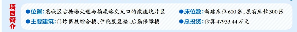 紅花湖院區項目一期工程位于惠州市惠城區古塘坳大道與福康路交叉口的激流坑片區。項目占地面積59581平方米,新建總建筑面積54040平方米,同時保留市復員退伍軍人醫院現有建筑5129平方米,新建床位600張(另保留市復員退伍軍人醫院原有床位300張),總投資估算47933.44萬元,主要規劃建設門診醫技綜合樓、住院康復樓、后勤保障樓,以及連廊、停車場和景觀綠化等。
