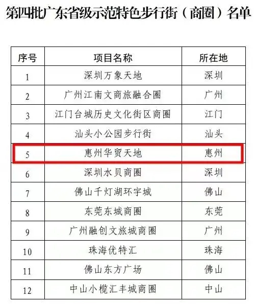 惠州日報訊 (記者劉煒煒 通訊員劉煒)廣東省商務廳近日印發了《關于公布第四批廣東省級示范特色步行街(商圈)名單的通知》,全省共有來自廣州、深圳、惠州等地的12個步行街(商圈)上榜,其中惠州華貿天地榜上有名。