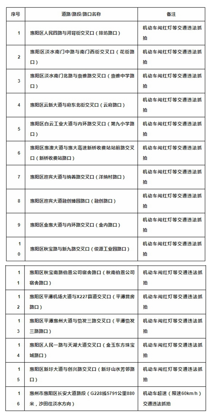 關于啟用惠陽區16個點位交通技術監控設備的公告