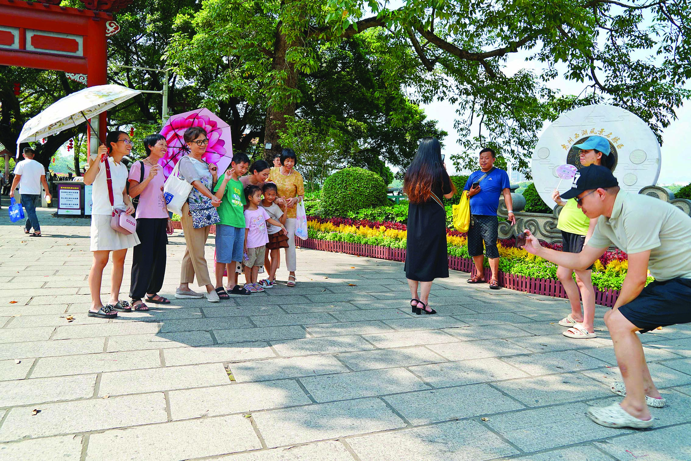 游客在惠州西湖開心合影。 惠州日?qǐng)?bào)記者李松權(quán) 張藝明 鐘暢新 黃鑫威 羅劍業(yè) 陳濤 攝