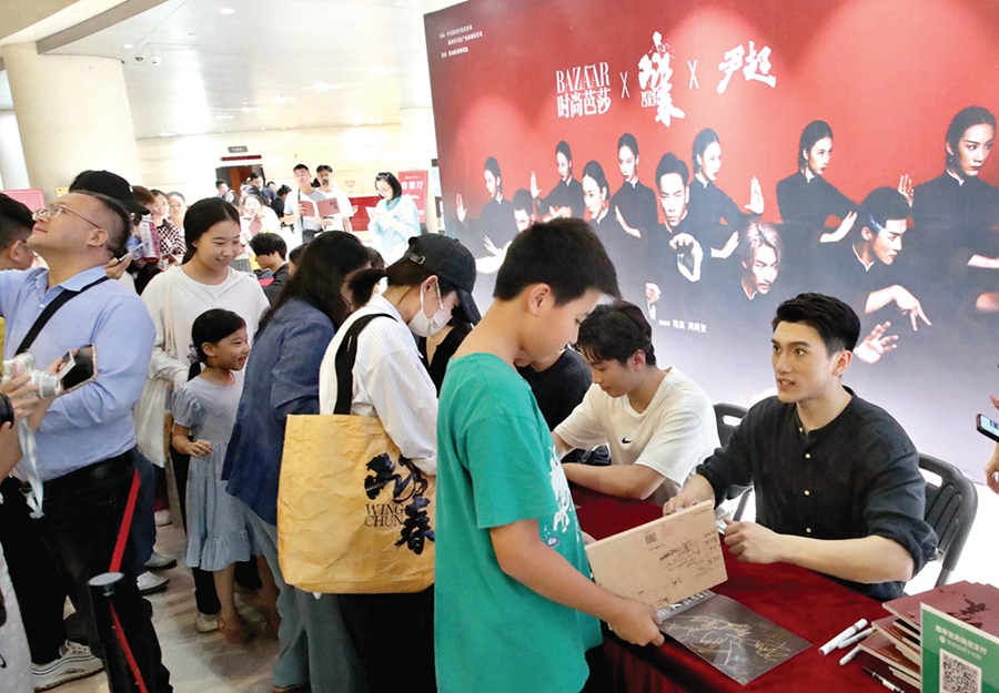 《詠春》場(chǎng)刊受到觀眾追捧,現(xiàn)場(chǎng)主演簽名售賣火熱。惠州日?qǐng)?bào)記者鐘暢新 攝