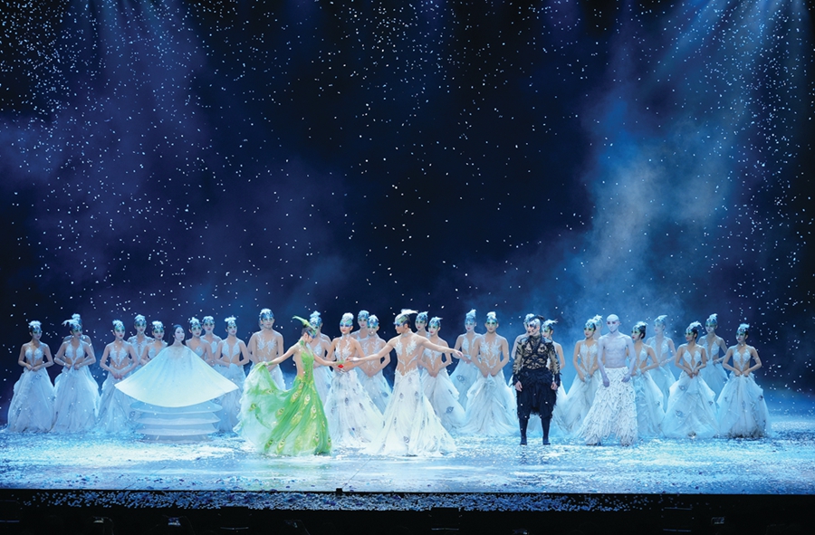 2022版舞劇《孔雀》以“生命”“愛”和“時(shí)間”為主題,通過(guò)孔雀與烏鴉的故事,呈現(xiàn)了一出由愛生羨、羨生妒、妒生恨、恨生殺、殺于死,死而涅槃再生的大自然悲喜劇。演出中,周而復(fù)始不停旋轉(zhuǎn)的“時(shí)間”,幕間穿插引導(dǎo)眾生的“神靈”,為這部劇增加舞劇的深度,引發(fā)觀眾的思考。