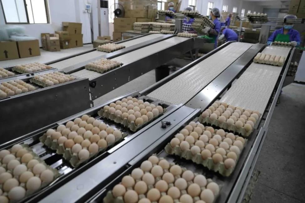 蛋雞剛生產的雞蛋立即通過輸送帶直接進入車間。