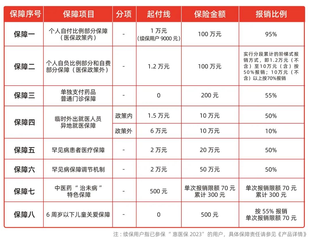 對連續參保 2023、2024 年“惠醫!钡膮⒈H私档蛡人自付比例部分保障(醫保政策內)起付線 1000 元,即起付線 9000 元?床箐N更多,個人花費更少。