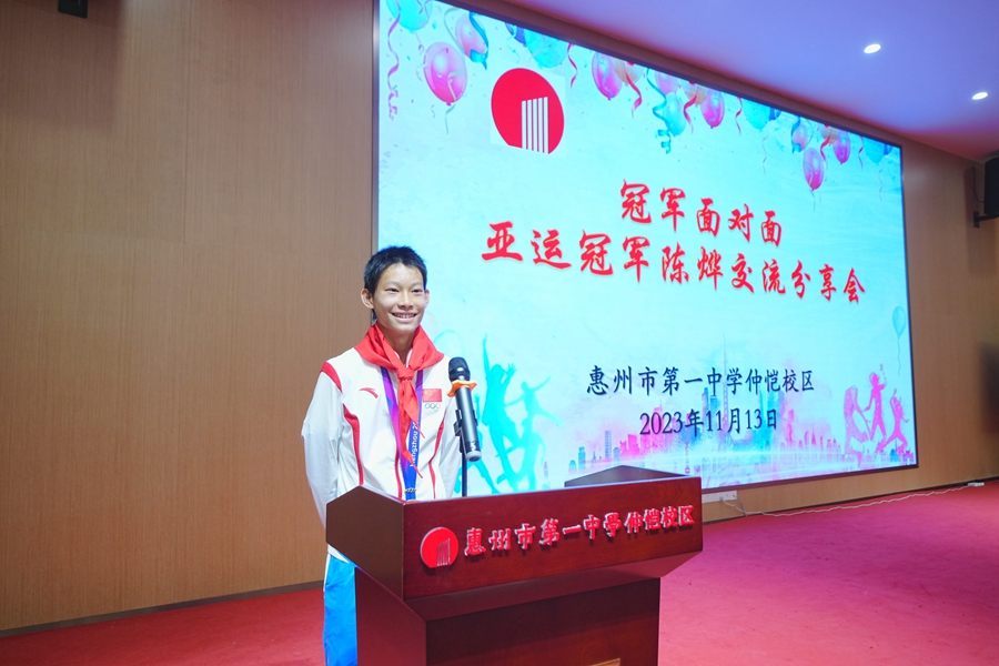 11月13日下午,惠州一中仲愷校區,年僅15歲的杭州亞運會滑板男子碗池冠軍陳燁,和父親陳玩欽一同來到校園出席面對面交流活動。作為最年輕的亞運金牌得主,陳燁的到來引來了師生們的陣陣歡呼。