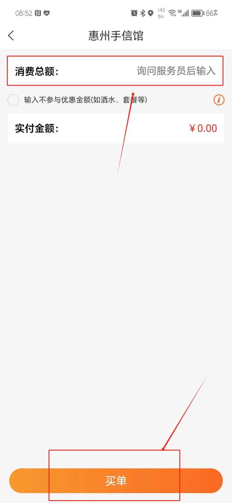 7.輸入店員提供的金額后,進入買單
