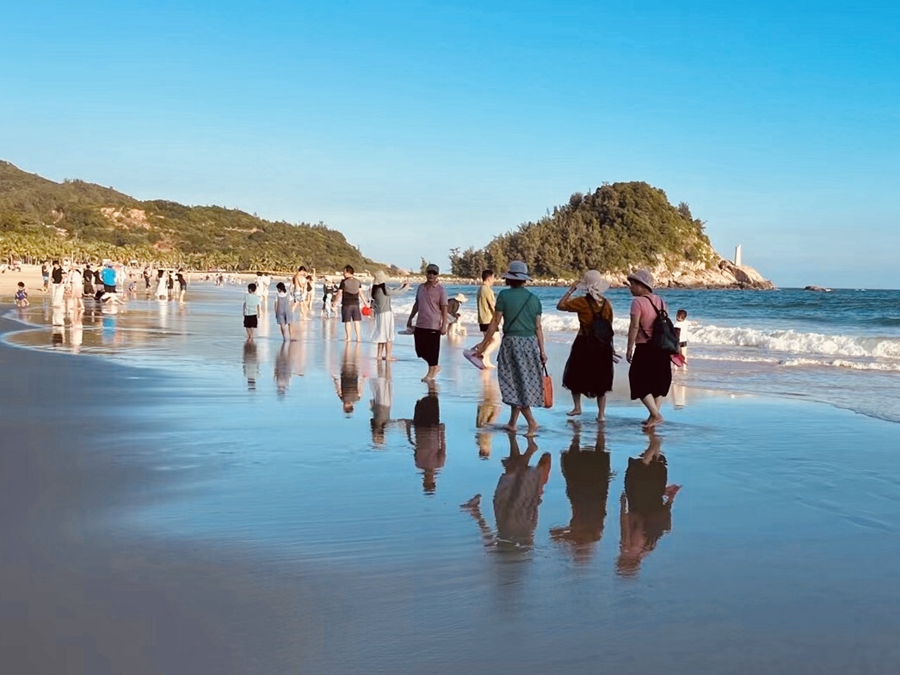 當(dāng)然,到海陵島一定要享受的,還是海邊時(shí)光。這里擁有風(fēng)光旖旎的海濱旅游資源,海水清澈,沙灘白潔細(xì)膩,十里銀灘、北洛灣都是漫步海灘、踏海逐浪的好地方。我們所住的酒店便在北洛灣,拉開窗簾觸目所及是寬闊的海景,下樓就是海灘。晨起,漫步在細(xì)軟的沙灘上等待日出,看金色光芒慢慢灑遍海面;午睡后,帶著孩子追逐海浪,清脆的笑聲隨著海風(fēng)飄揚(yáng)在沙灘上,遠(yuǎn)遠(yuǎn)看見兩位保潔拉著籮筐在沙灘上將游客遺落的少量垃圾拾起,孩子放下手中的沙鏟跑去幫忙,潔白的沙灘上很快恢復(fù)了干凈;晚歸,海灘上的燈光已經(jīng)亮起,人們或閑坐岸邊,點(diǎn)幾串燒烤,喝一點(diǎn)小酒,聽海潮聲聲;或攜手沿著海岸慢慢前行,心緒在潮聲中逐漸寧?kù)o。行程的第二天,我們還去到了十里銀灘參加篝火晚會(huì),大家圍成一圈,圍著篝火,隨著節(jié)奏感極強(qiáng)的音樂跳舞,是久違的酣暢淋漓。