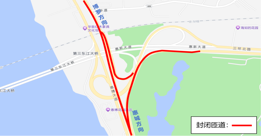 (二)木墩湖立交:三環北路往惠博大道東半幅的出口匝道及惠博大道東半幅往三環北路的進口匝道封閉,其余匝道放通。