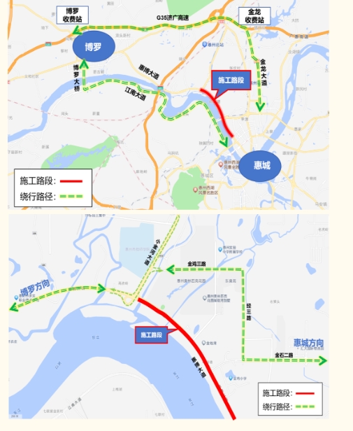 通過江南大道(超限車輛除外)或G35濟廣高速公路(博羅收費站-金龍收費站)繞行;或通過小金河大道立交,從金雞三路、經三路、金石二路等道路繞行。