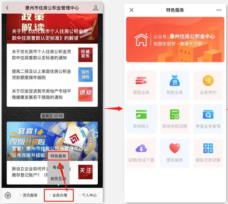 繳存職工還可在“惠州市住房公積金管理中心”微信公眾號的【業務辦理】—【特色服務】中,辦理相關住房公積金業務。