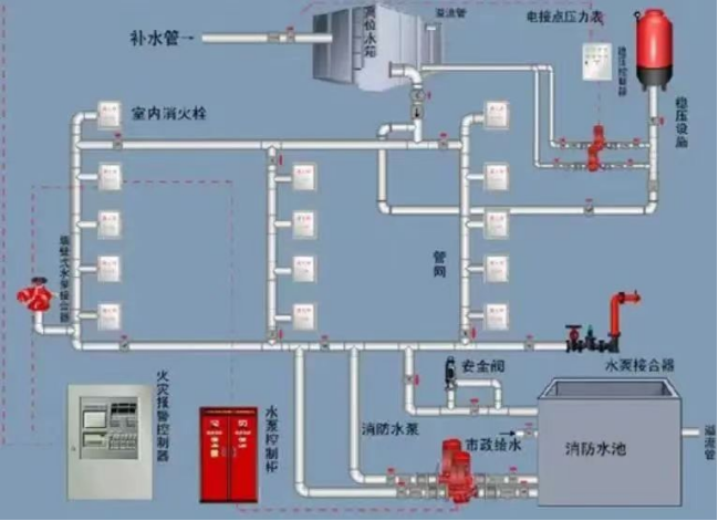 消火栓系統是由供水設施、消火栓、配水管網和閥門等組成的系統。