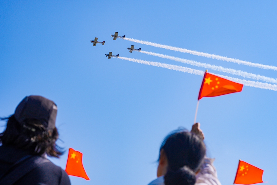 碧空之下國旗招展,原來是湖南山河飛行表演隊正在為觀眾表演高難度“鳳尾”展開和分層交叉開花等“定制”飛行動作。據了解,山河飛行表演隊隸屬于湖南山河通航有限公司,正式成立于2014年,是國內第一支運動飛機表演隊,也是第一支純國產的民間飛行表演隊。4架表演機均為山河自主研發生產的阿若拉SA60L單發雙座前三點式起落架飛機,這是我國首個取得中國民航局適航認證的民族自主品牌輕型運動飛機。以藍天為畫布,他們精湛的飛行技藝,讓觀眾目不暇接。