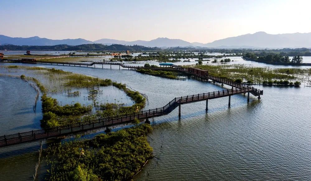 在好招樓市級濕地公園放眼望去,海岸線和海岸帶綿延不絕,紅樹林生長茂盛,呈環狀分布在考洲洋畔;近處海面上,船只競相出海,漣漪陣陣,呈現出人與自然和諧共生的美麗圖景。
