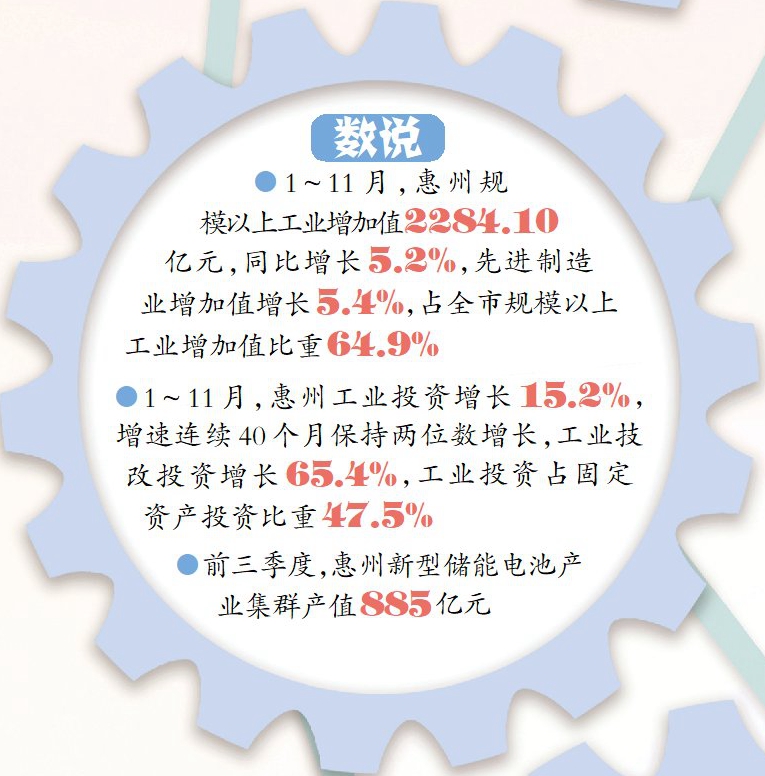 一年來,惠州引進(jìn)一批標(biāo)志性項(xiàng)目落地,呈現(xiàn)出央企、民企、外企同臺(tái)競(jìng)技,以大帶小的生動(dòng)局面。今年前三季度,惠州在建工業(yè)項(xiàng)目1569宗,總投資6880億元,超10億元項(xiàng)目135宗;工業(yè)投資總量居全省第2位,截至今年11月,增速連續(xù)40個(gè)月保持兩位數(shù)增長(zhǎng)。