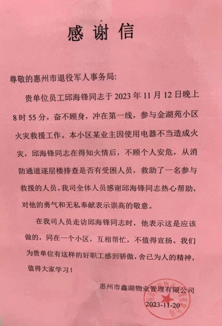 日前,一封來自小區物業的感謝信,讓惠州市退役軍人服務中心主任邱海鋒勇闖火場解救被困老人的事跡“藏不住了”。此前邱海鋒遇火災逆向而行,緊急疏散鄰居,逐層搜索排查,勇闖火場解救被困老人,被小區業主親切稱為“新時代最美鄰居”。