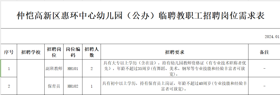 2024年1月仲愷高新區惠環中心幼兒園(公辦)臨聘教職工招聘