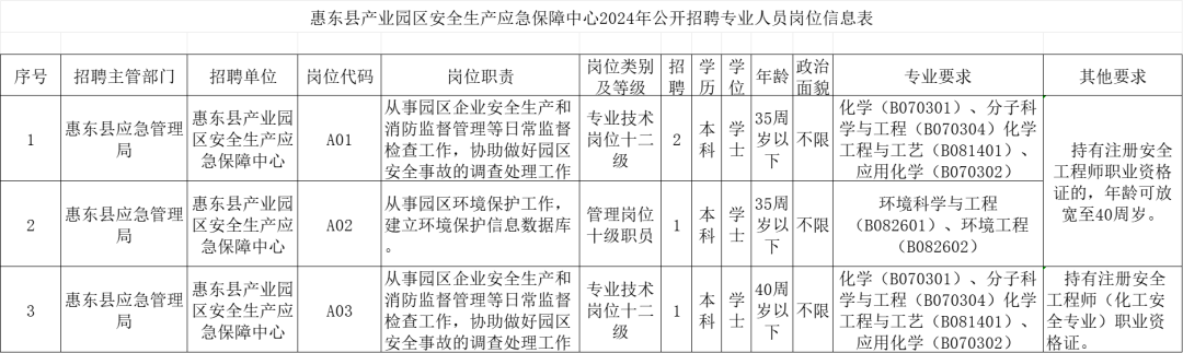 惠東縣產業園區安全生產應急保障中心公開招聘專業人員