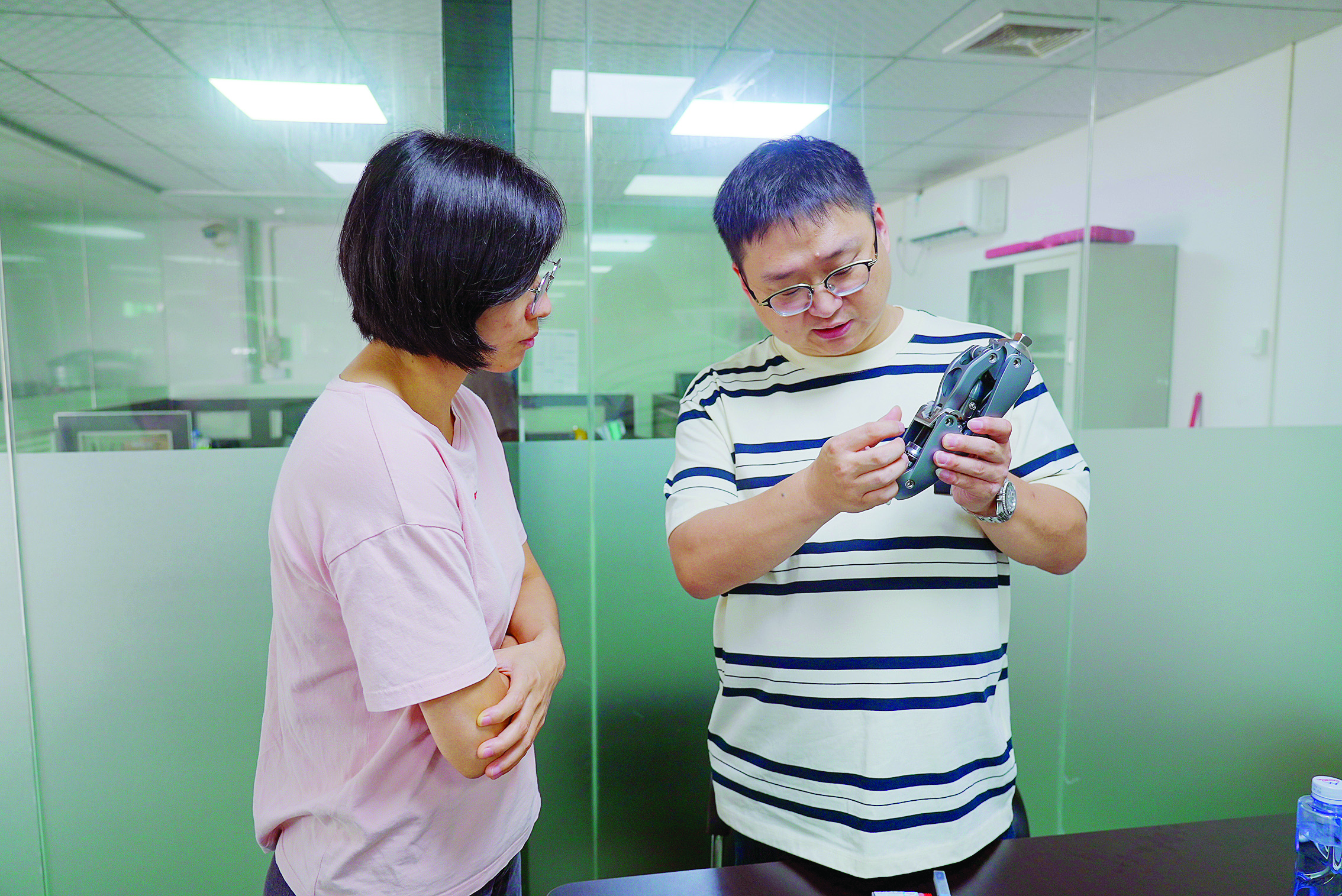 盛鑫(右)向記者介紹公司最新研發的假肢產品。