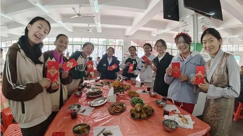 除夕夜,惠州八中組織西藏班的孩子們一起吃年飯,同學們向記者展示老師送給他們的新年利是。