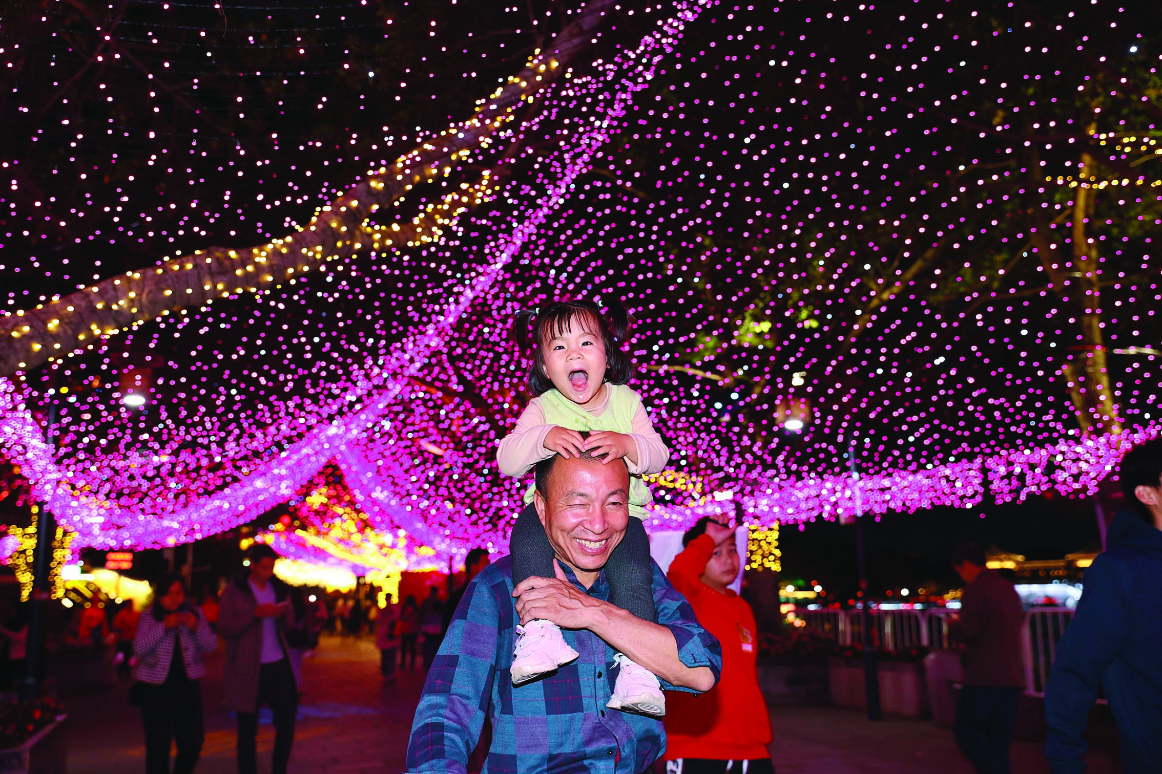 大人背著小孩逛燈會,幸福與快樂寫在臉上。