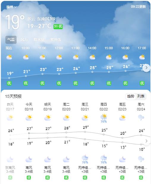 惠州日報訊 (記者劉建威)“未來三天我市各地天氣暖濕,早晚有(輕)霧,偶有零星小雨,氣溫趨于回升。”市氣象臺2月17日提醒,2月18至20日我省云量增多,濕度加大,大部市縣早晨有(輕)霧,部分市縣有零星小雨,氣溫總體趨于回升。雨霧天氣能見度較低,需注意春運返程交通安全。