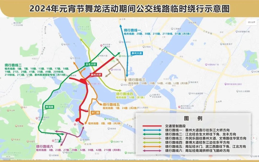 2024年2月24日,我市將在體育中心至西湖景區沿線道路舉行“元宵舞龍”活動。因此,云山西路(體育中心)、惠州大橋、環城西路至圓通橋沿線將實施臨時管控。