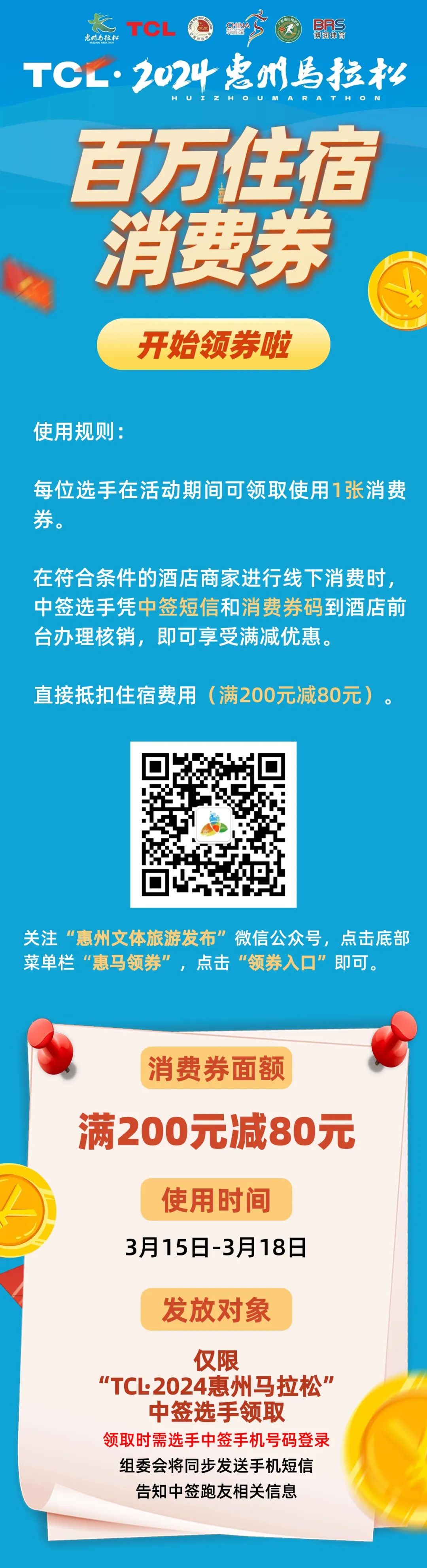 點擊“惠州文體旅游發布”公眾號底部菜單欄“惠馬領券”選擇“領券入口”,進入活動頁面,使用中簽手機號碼授權登錄,點擊“領取”即可。