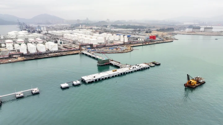 建設中的惠州港荃灣港區5萬噸級液化烴碼頭和荃美石化碼頭(較遠處)。惠州日報記者鐘暢新 攝