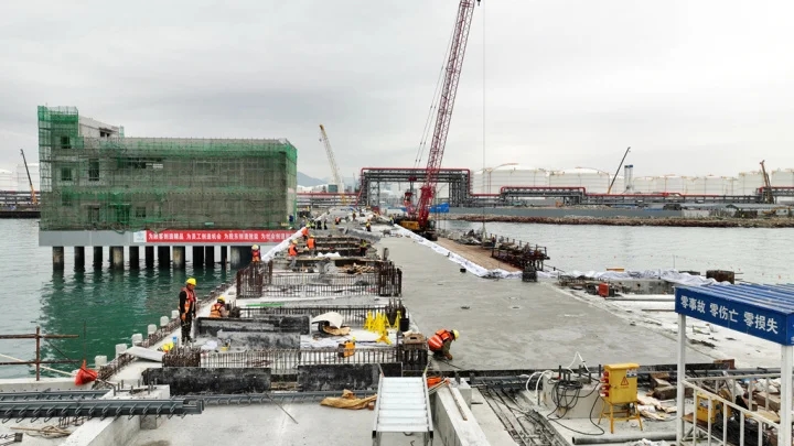 近日,記者在現場看到,項目水工平臺施工已近尾聲,綜合樓、設備用房等也在緊張施工中。華學輝介紹,項目分為兩個標段建設,其中,水工施工標段形象進度已完成96%,正在進行疏浚工程、上部結構工程、停靠船與防護設施工程及海水泵房工程施工;包括綜合樓、設備用房基礎及擋浪墻與護岸施工等在內的安裝工程標段,形象進度已完成7%,項目施工總形象進度已完成67%,按計劃將在今年底建成。屆時,原材料運到惠州港后將在碼頭接卸,并通過公共管廊運到庫區儲存。