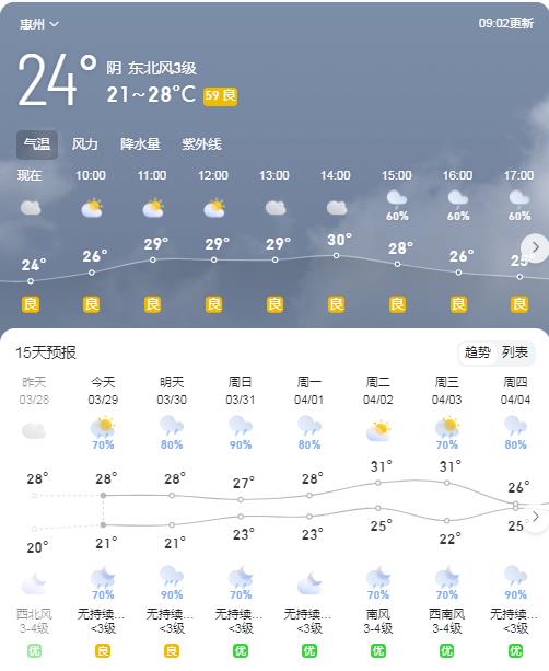惠州日報訊 (記者劉建威)惠州市氣象臺3月28日下午發布重大氣象信息,預計29日我市各地多云間陰天,有分散(雷)陣雨;30~31日將出現今年首場強對流天氣過程,有中到強雷雨局部暴雨,局地伴有短時強降水、6~8級雷雨大風和冰雹等強對流天氣,最大小時雨強20~40毫米;4月1~2日,有陣雨或雷陣雨。