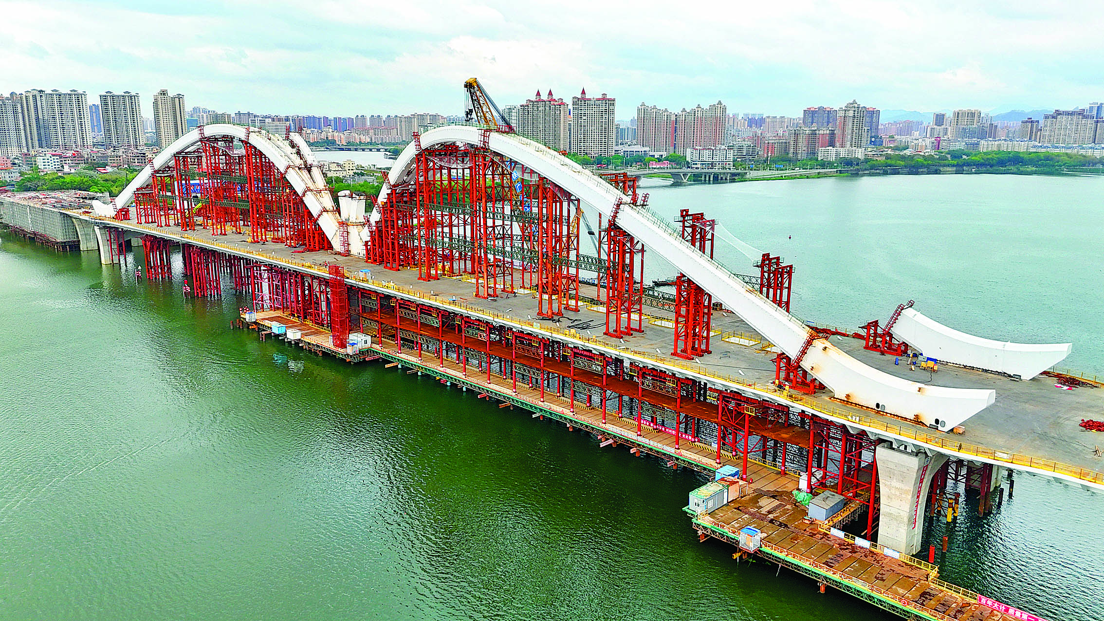 目前,鵝城大橋樁基施工全部完成,江東一號路A匝道及輔道已通車,主橋下部架構及鋼梁架設已完成,拱肋已完成30個節段,鵝塔已完成2個節段,大橋計劃今年建成通車。