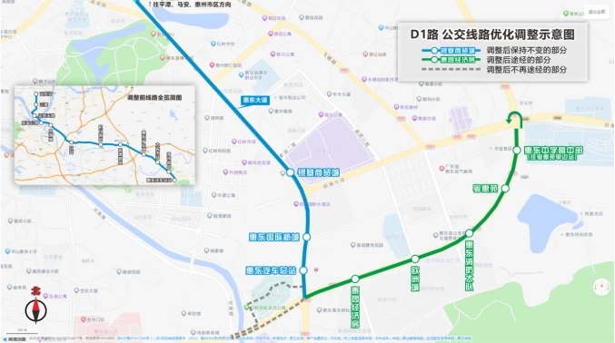 調整走向:首末站由惠東汽車總站站外延伸經環城北路至粵惠苑,新增設泰園經濟房、歐洲城、惠東消防大隊、惠東中學高中部(單邊)、粵惠苑等5個站點。