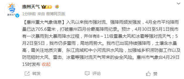惠州市氣象臺4月29日15時發布惠州重大氣象信息