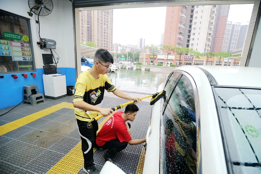 “有車來了。”一直關注著外面的陳佳浩見一輛車開了進來,馬上迎了上去。黃博勝、黃秋迪也圍了上來。“要洗車嗎?”活潑的陳佳浩與車主交談后,接過車主手中的鑰匙,大家開始分工。