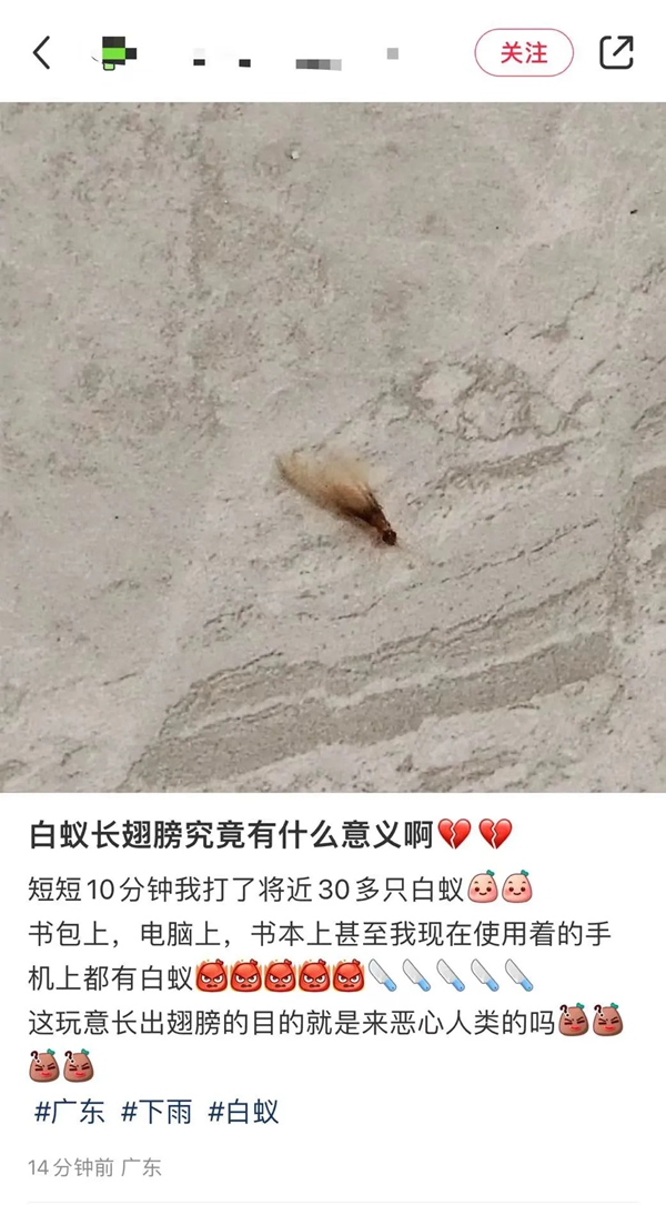 專家指出,在白蟻分飛期內,有翅繁殖蟻一般在雨后悶熱的傍晚前后飛出,請市民群眾多關注家里是否有白蟻出現。一旦家中發現有翅繁殖蟻,莫恐慌,白蟻不影響人體健康,且有翅繁殖蟻存活幾率極低。