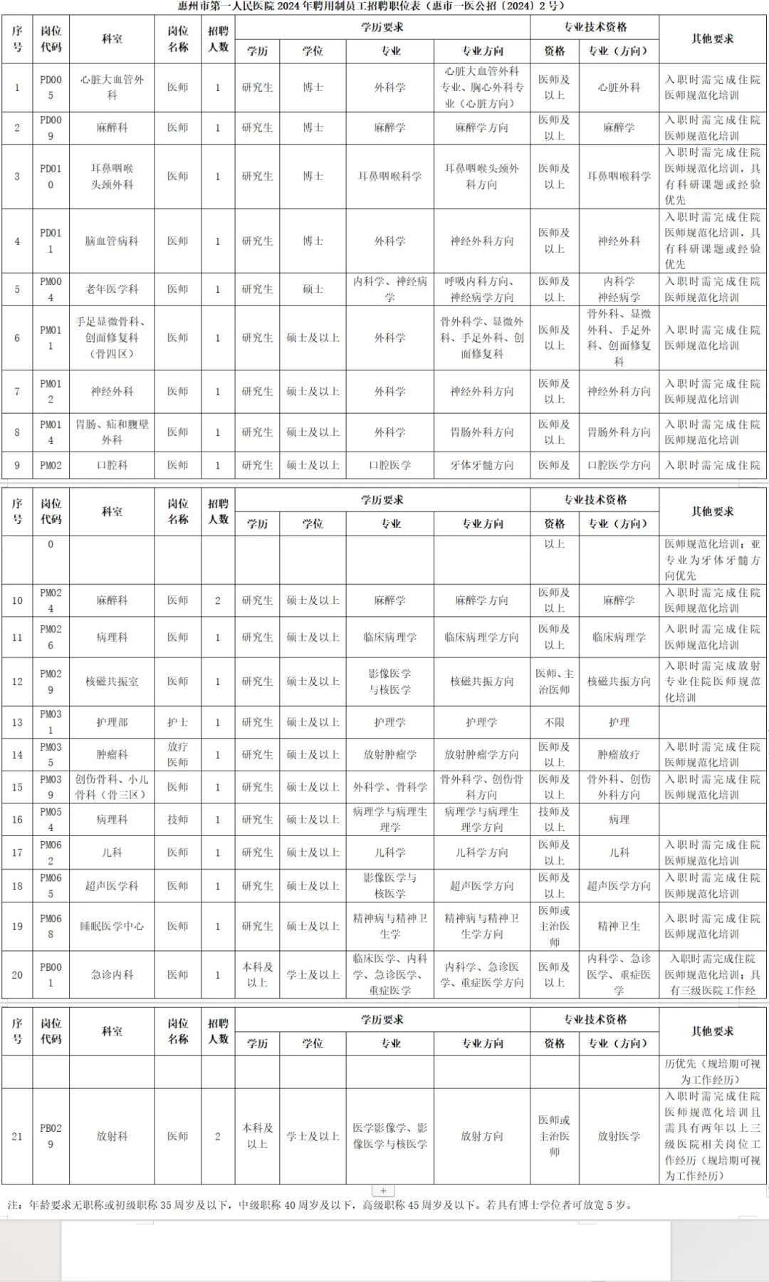 惠州市中心人民醫院2024年第二批臨聘人員招聘
